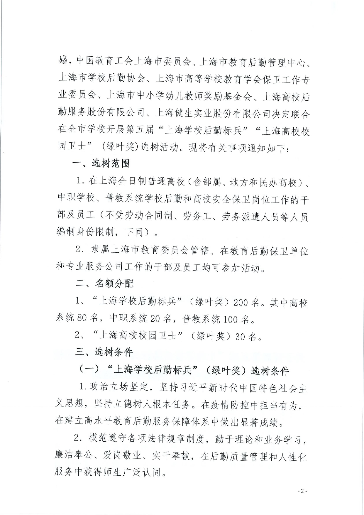 关于开展第五届“上海学校后勤标兵”“上海高校校园卫士”(绿叶奖)选树活动的通知