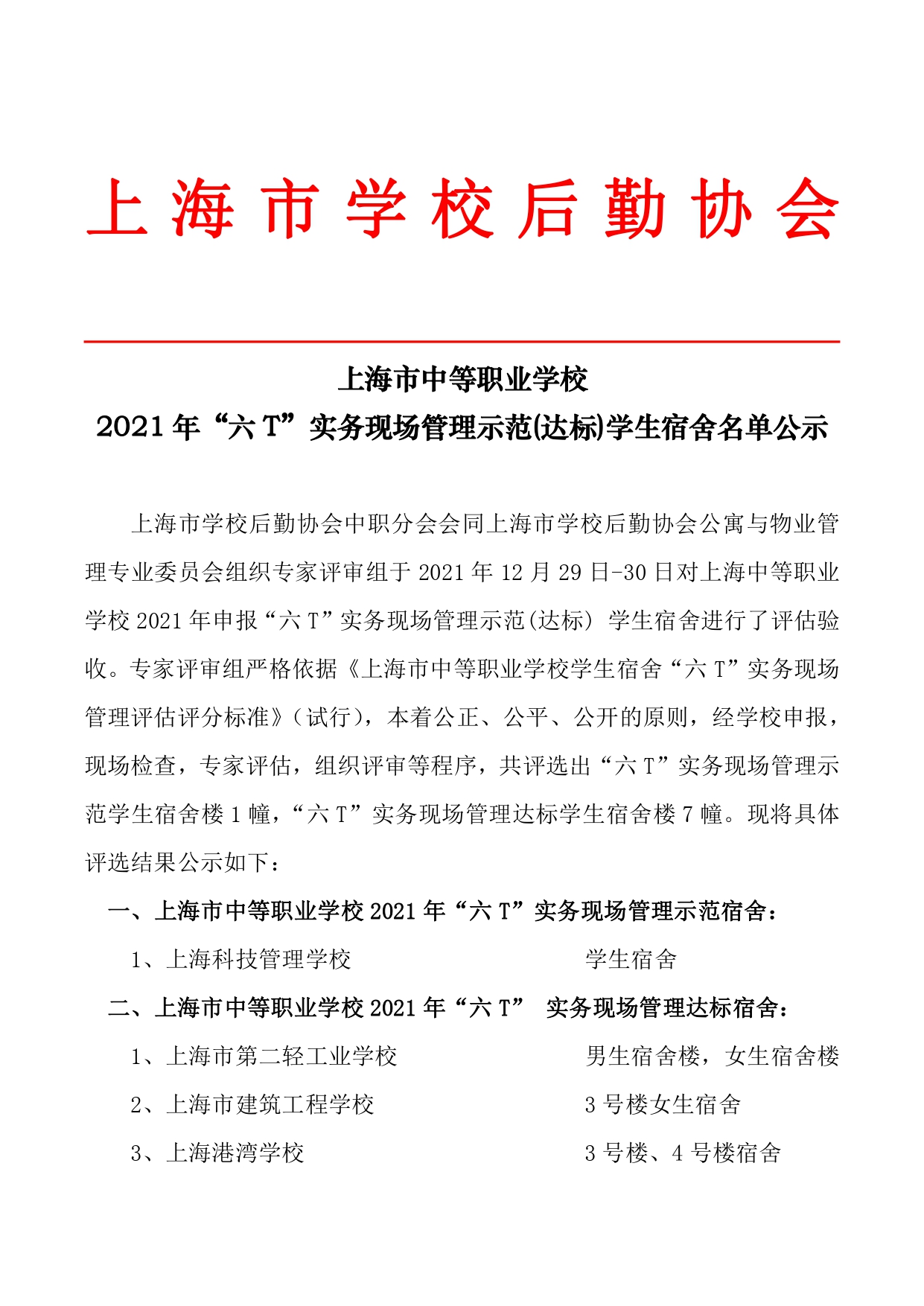 上海市中等职业学校 2021年“六T”实务现场管理示范(达标)学生宿舍名单公示