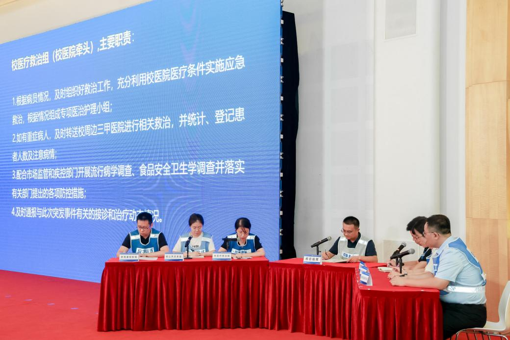 本次演练模拟高校食堂突发食源性疾病事件,围绕“事故报告、预案启动、应急处置、舆情应对、响应终止”等关键环节,开展全链条、全流程实战化演练。演练现场,学校迅速启动应急响应,成立由校领导担任总指挥的应急处置指挥部,下设调查组、综合协调组、危害控制组、医疗救治组、公共关系组、安抚疏导组等六个工作组,协同区市场监管、卫健、疾控等部门高效联动,第一时间完成患者救治、现场封存、溯源调查、信息发布、舆情引导、善后安抚等工作,有效控制了事态发展。